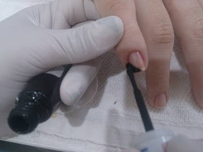 Com o verniz preto, começa por traçar dois triângulos nas laterais superiores das unhas ou traça apenas um triângulo na lateral superior da unha.
